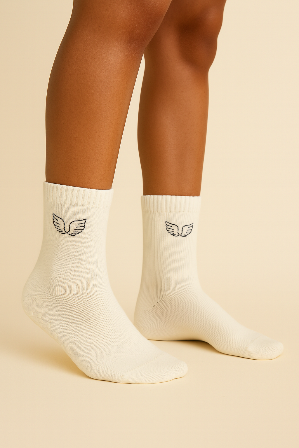 The Wing Pilates Socks are designed for grip and comfort. Made in a breathable cotton blend with added stretch, they feature Kailoom’s wing embroidery and a silicone sole grip for secure footing. Balanced between performance and lounge, they’re ready for the mat or home.